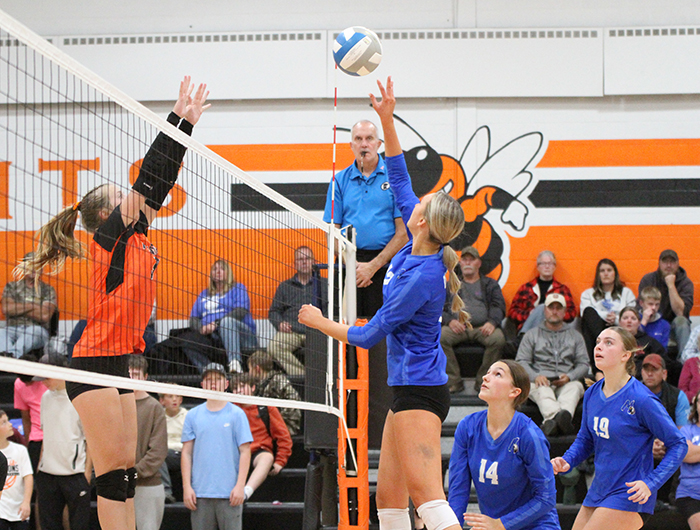 Annika Dunrud sends a spike past a would-be Henning blocker during last week’s game against the Hornets.