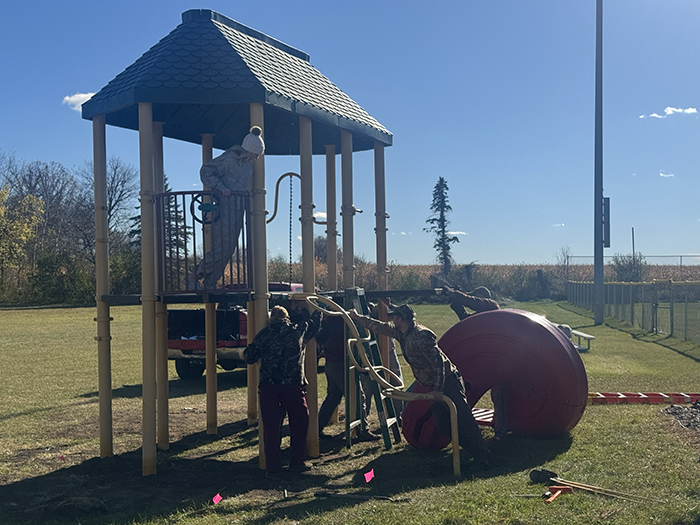 Members of the Deer Creek Lions Club, Deer Creek Shockers baseball program and City of Deer Creek installed new playground equipment at the Deer Creek baseball field on Sunday afternoon. The new equipment was purchased with a number of local donations, including a donation from the Deer Creek Lions Club, as part of a continued effort to enhance the area around the baseball field.