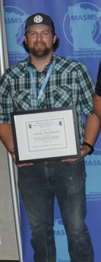 Adam Zachman, New York Mills School, completed the MASMS Facility Manager Certification Program offered by the Minnesota Educational Facilities Management Professionals Association (MASMS).