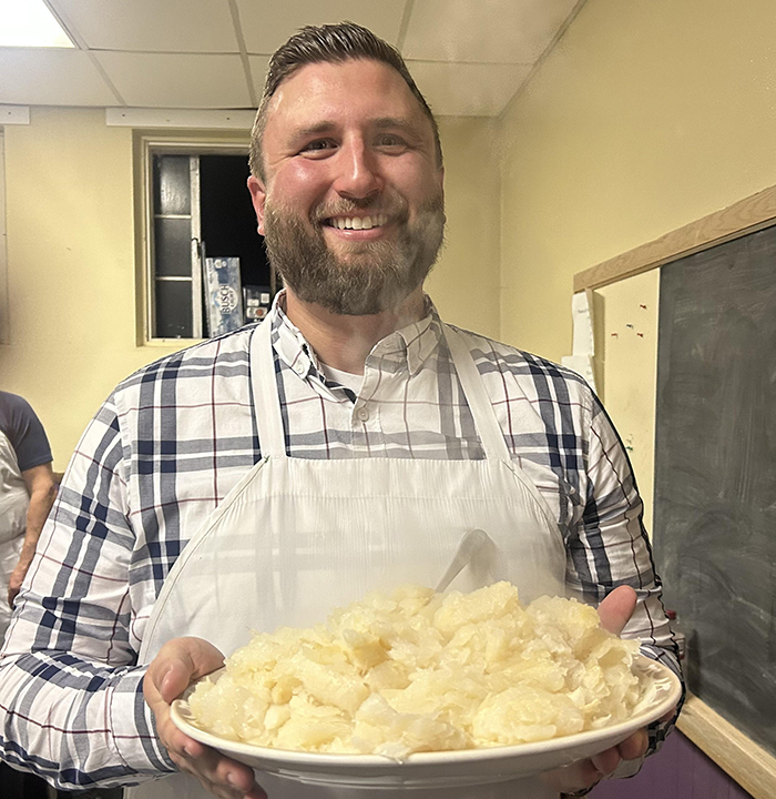Jens Gylland leaves the church kitchen with a large plate of lutefisk to serve family style Thursday evening, Nov. 20, at Our Savior’s Lutheran Church in Barnesville. This annual lutefisk and meatball feed is held one week before Thanksgiving.