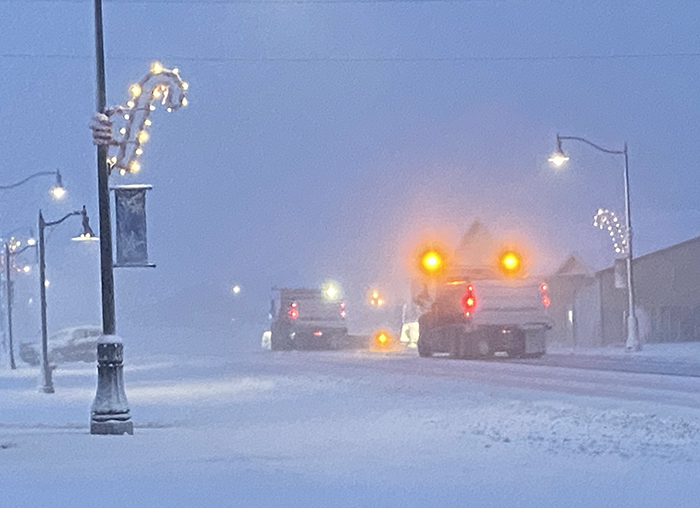 Otter Tail County snowplows were seen in NY Mills in the early afternoon clearing county highways in order for students and workers to get safely home. The Otter Tail County Sheriff’s Department reminded those traversing snowy roads to turn on headlights, reduce speed, and leave early in order to reach their destination on time.